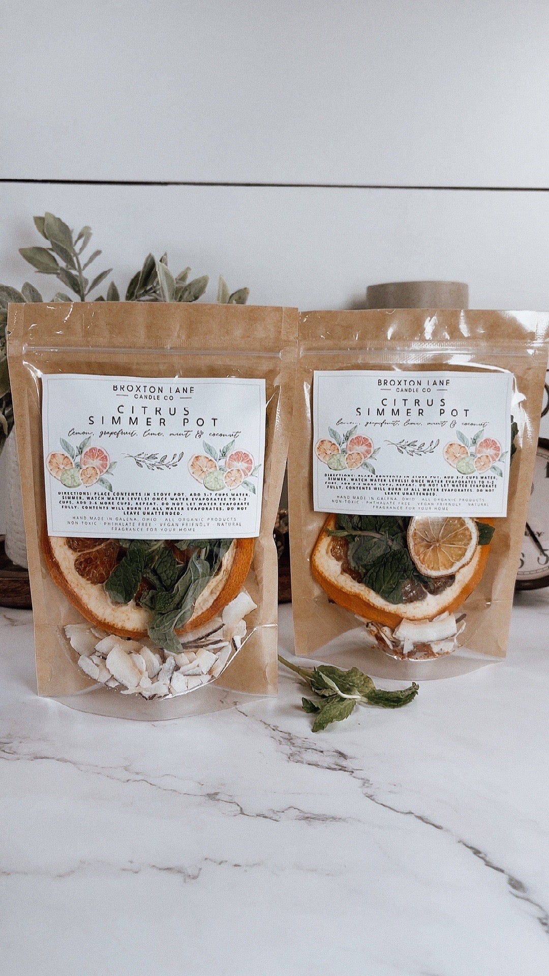 Our handcrafted Simmer Mix is made with organic, all-natural ingredients including fresh dried orange and lime slices, anise stars, nutmeg, cinnamon sticks, cardamom buds, and shaved coconut and much more.