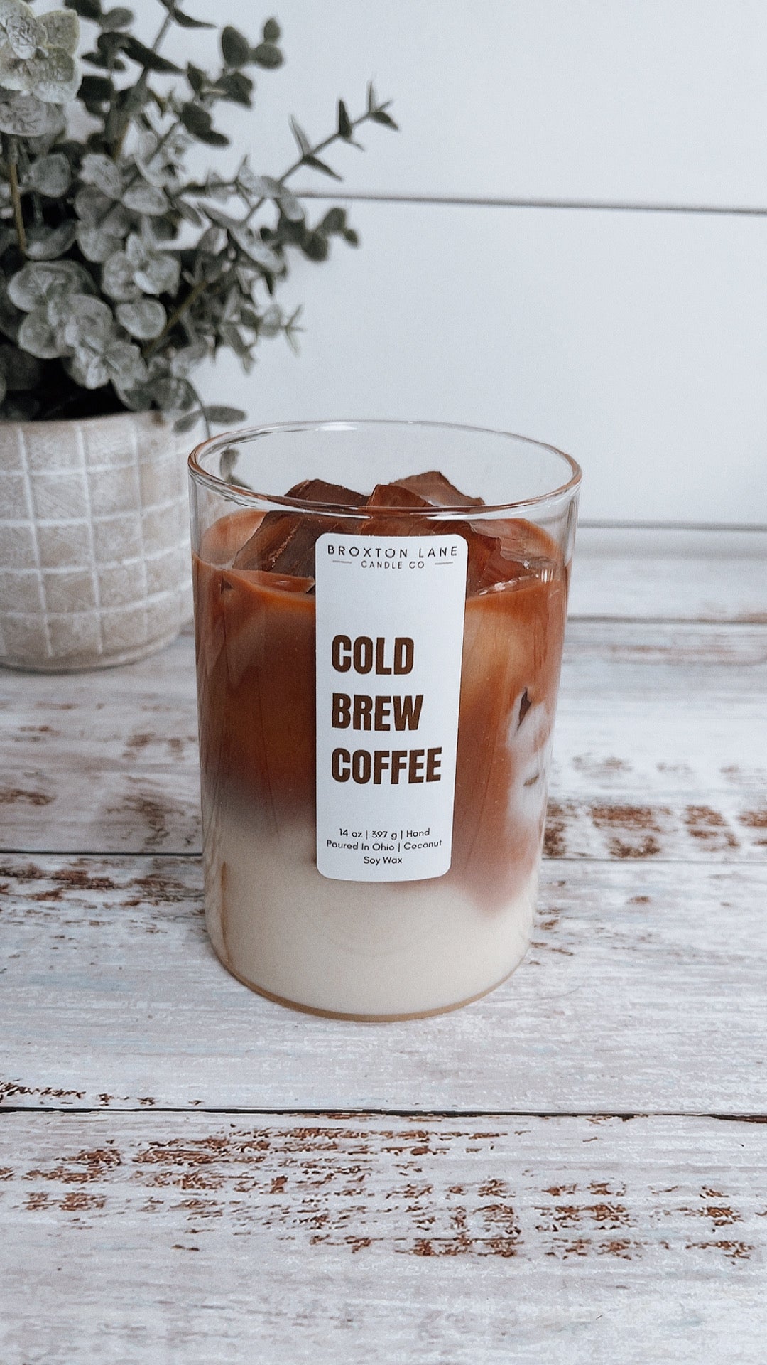 14 ounces of pure coffee smells in a fun glass vessel with gel wax ice cubes.